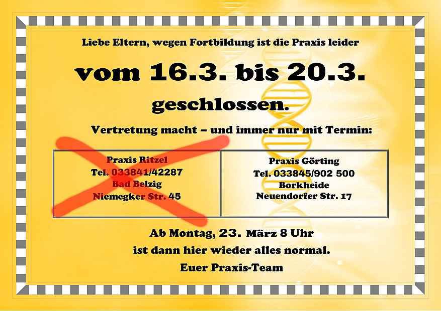 Praxisurlaub. Praxis geschlossen.